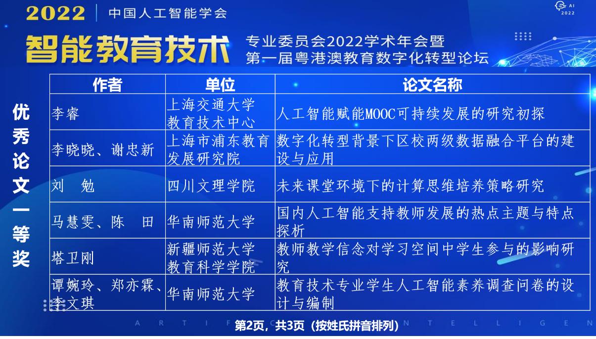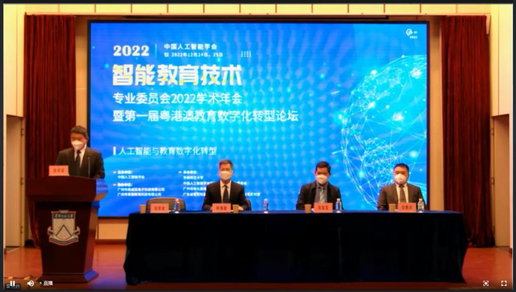 当今的时代是人工智能迅猛发展的时代,各行各业均离不开人工智能的大力支持,教育领域同样如此。2017年国务院对我国人工智能的发展制定了纲领性的文件《新一代人工智能发展规划》,其中,提出在人工智能在教育领域应该“利用智能技术加快推动人才培养模式、教学方法改革,构建包含智能学习、交互式学习的新型教育体系”。为了响应国家的号召,由中国人工智能学会(CAAI)主办,中国人工智能学会智能教育技术专业委员会、华南师范大学、广州市电化教育馆、广东省哲社科重点实验室人工智能与智慧教育实验室联合承办的智能教育技术专业委员会2022学术年会暨第一届粤港澳教育数字化转型论坛于2022年12月24、25日在广州召开(线下线上结合的方式)。