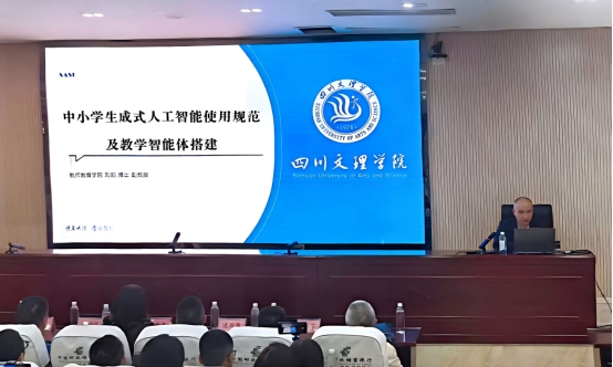 为深化人工智能在中小学教育教学中的融合应用,提升教师数字素养与教学创新能力,2025年9月28日,达州市电化教育与技术装备中心在万源第三中学举办中小学人工智能应用专题培训,全市300余名智慧教育“种子教师”参会。买球官网小学教育专业教研室主任刘勉博士受邀以专家身份出席,并作“中小学生成式人工智能使用规范及教学智能体搭建”主题演讲。